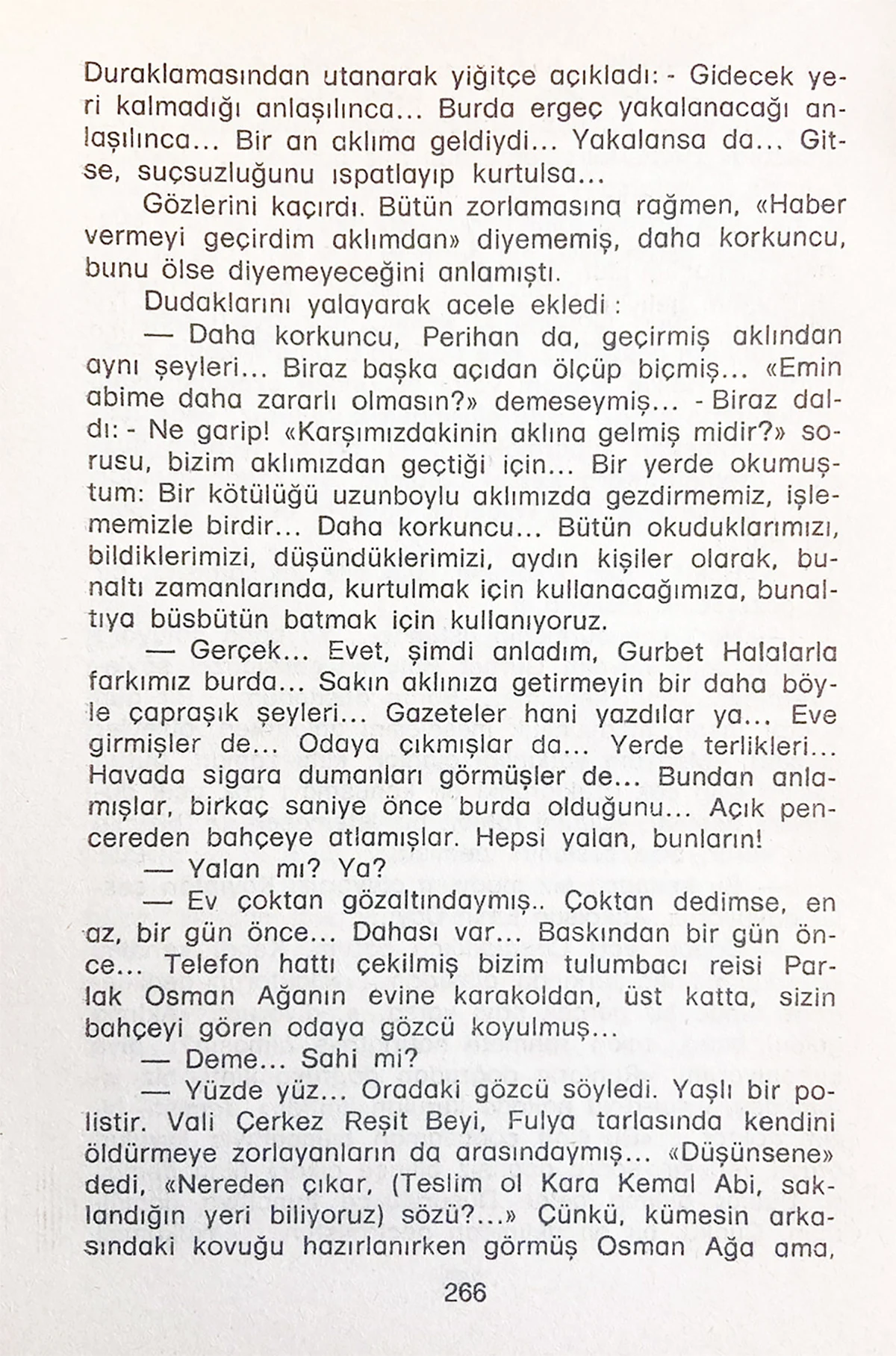 “Gerçek… Evet, şimdi anladım. Gurbet Halalarla farkımız burda… Sakın aklınıza getirmeyin bir daha böyle çapraşık şeyleri… Gazeteler hani yazdılar ya… Eve girmişler de… Odaya çıkmışlar da… Yerde terlikleri… Havada cigara dumanları görmüşler de… Bundan anlamışlar birkaç saniye önce burda olduğunu… Açık pencereden bahçeye atlamışlar. Hepsi yalan bunların!”