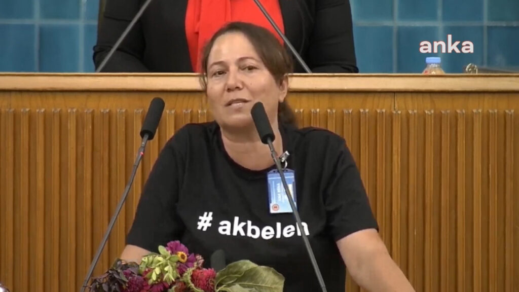 Kılıçdaroğlu’ndan önce Akbelenli Nejla İzci kürsüye gelerek bölgede yaşananlarla ilgili bir konuşma yaptı. İzci, kürsüye “Her yer Akbelen, her yer direniş” sloganları ile çıktı.