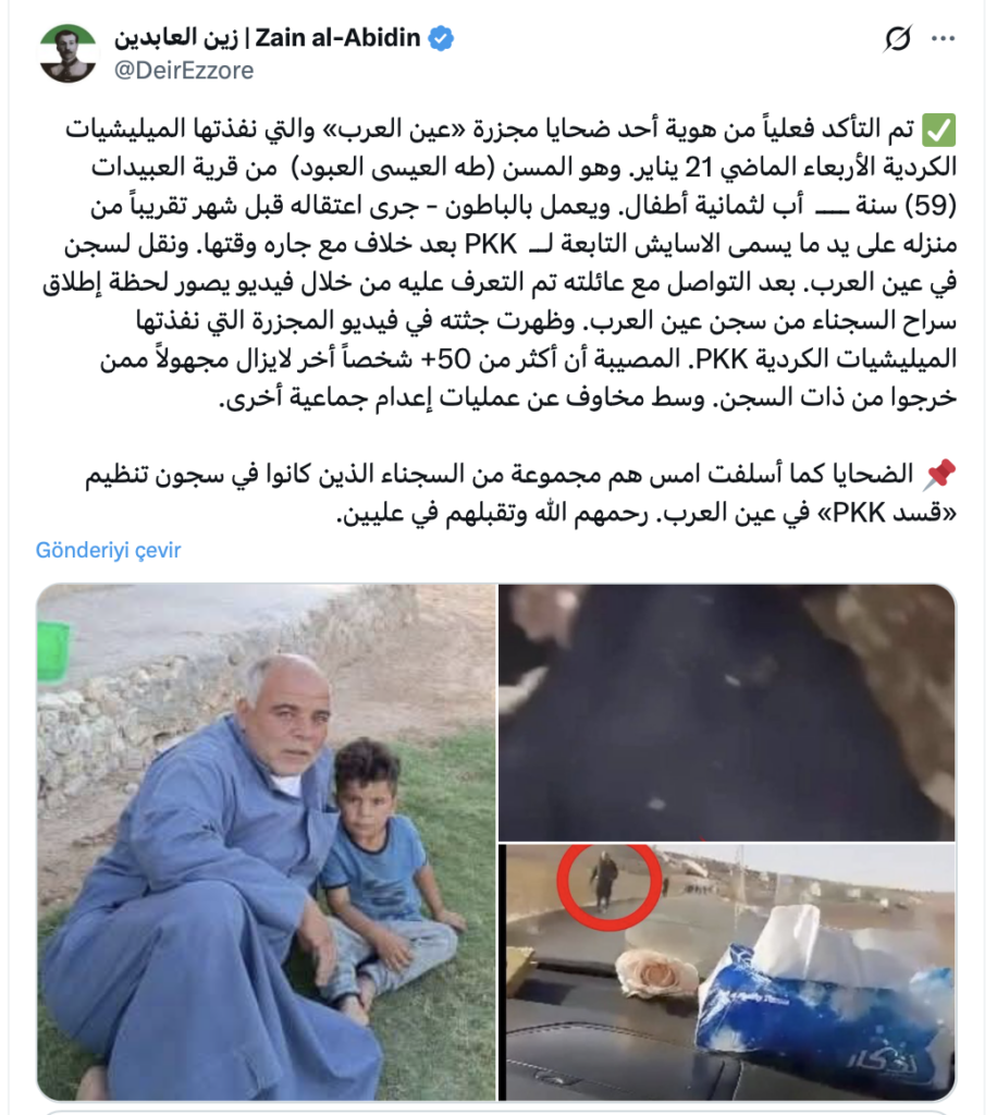 Ancak öldürülenlerin Kobani’de SDG’nin kontrolündeki cezaevinden 21 Ocak’ta tahliye edilen sivil insanlar oldukları iddia ediliyor.