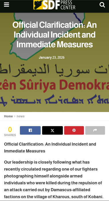 SDG açıklamasında Şam’a bağlı güçler tarafından Kobani’nin güneyindeki Kharous köyüne bir saldırı yapıldığı ve videonun da bu saldırının ardından çekildiği iddia edildi.