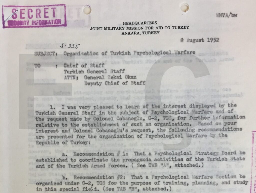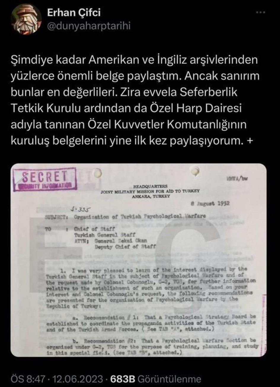 1952 yılına ait olduğu görülen belgeler için Çiftçi, “Bu belgelerde Türk Genelkurmayı’nın kendi bünyesinde bir psikolojik harp departmanı kurmak istediği ve bunun için Kur. Alb. Emin Çobanoğlu aracılığıyla Amerikalılardan yardım talep ettiği görülüyor” mesajını paylaştı.