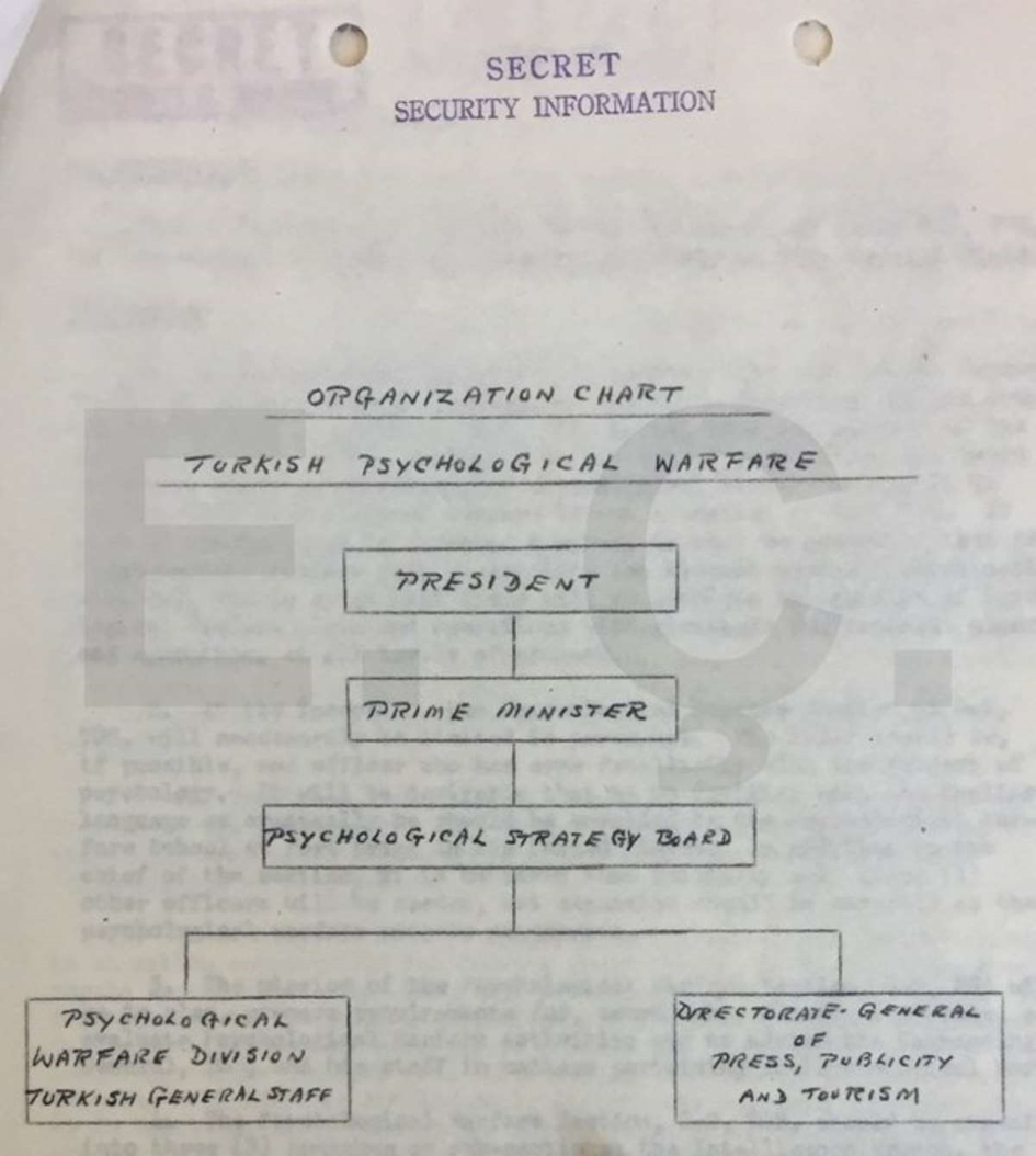 ABD’nin önerisine dair arşivde, “psikolojik harp işleri ile meşgul olacak teşkilat yapısının siyasi ve askerî boyutları şemalarla” anlatıldığını dile getiren Çiftçi, “proje”nin siyasi boyutunu gösteren çizimi de paylaştı: