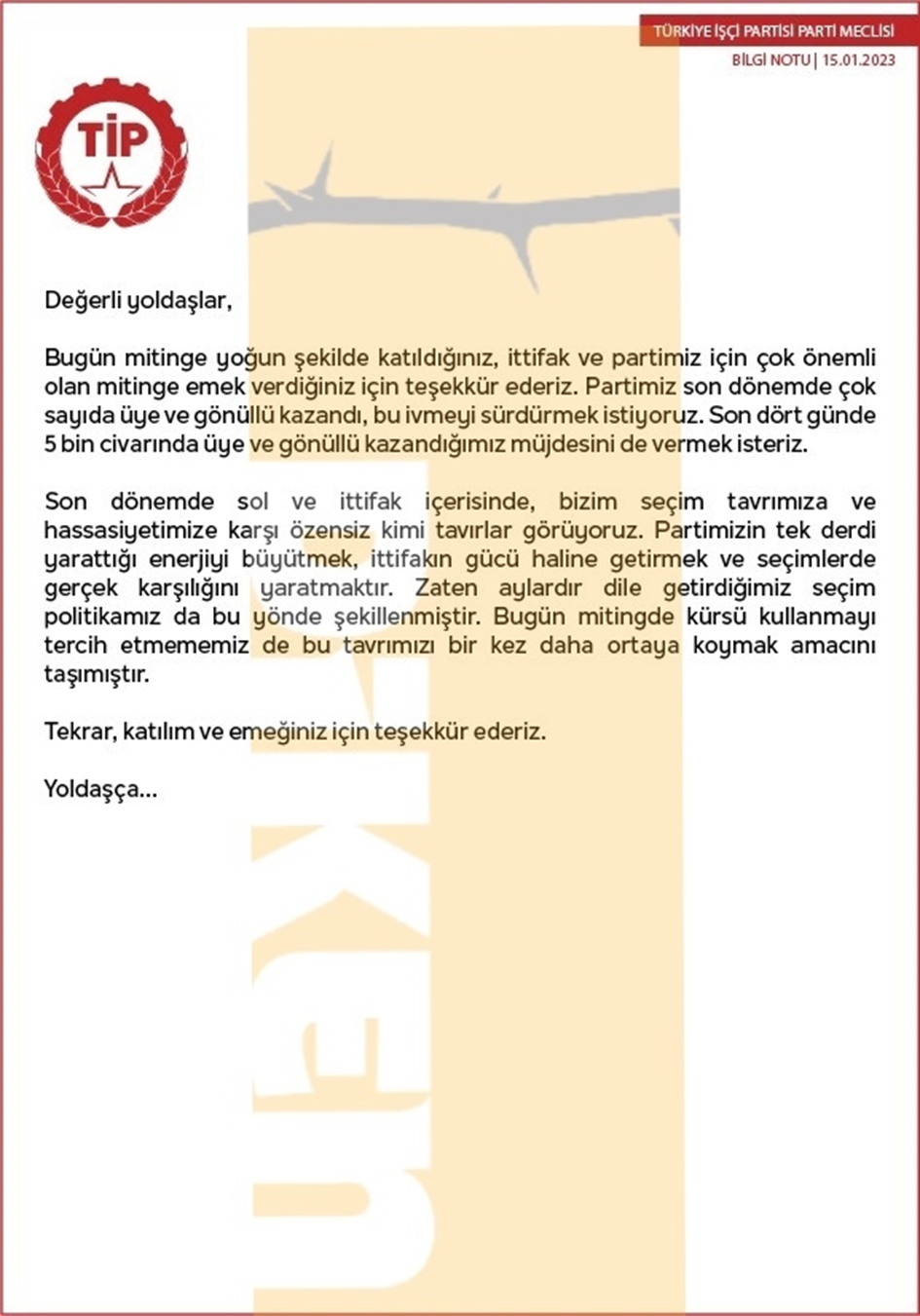 TİP üyelerine mitingdeki tutumunu açıklayan bilgi notu gönderdi