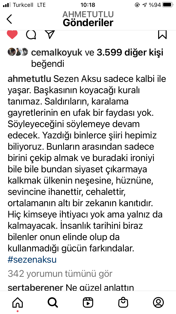 Sezen Aksu sadece kalbi ile yaşar. Başkasının koyacağı kuralı tanımaz. Saldırıların, karalama gayretlerinin en ufak bir faydası yok. Söyleyeceğini, söylemeye devam edecek. Yazdığı binlerce şiiri hepimiz biliyoruz. Bunların arasından sadece birini çekip almak ve buradaki ironiyi bile bile buradan siyaset çıkarmaya kalkmak ülkenin neşesine, hüznüne, sevincine ihanettir, cehalettir, ortalama zekanın altı olmanın kanıtıdır. Hiç kimseye ihtiyacı yok ama yalnız da kalmayacak. İnsanlık tarihini biraz bilenler onun elinde olup da kullanmadığı gücün farkındalar.