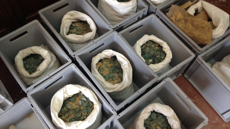 19 adet Amfora adı verilen çömleğin içinde bulan bronz sikkeler yaklaşık 600 kilo geliyor. Sikkelerdeki imparatorun Constantine veya Maximilian olduğu sanılıyor.
