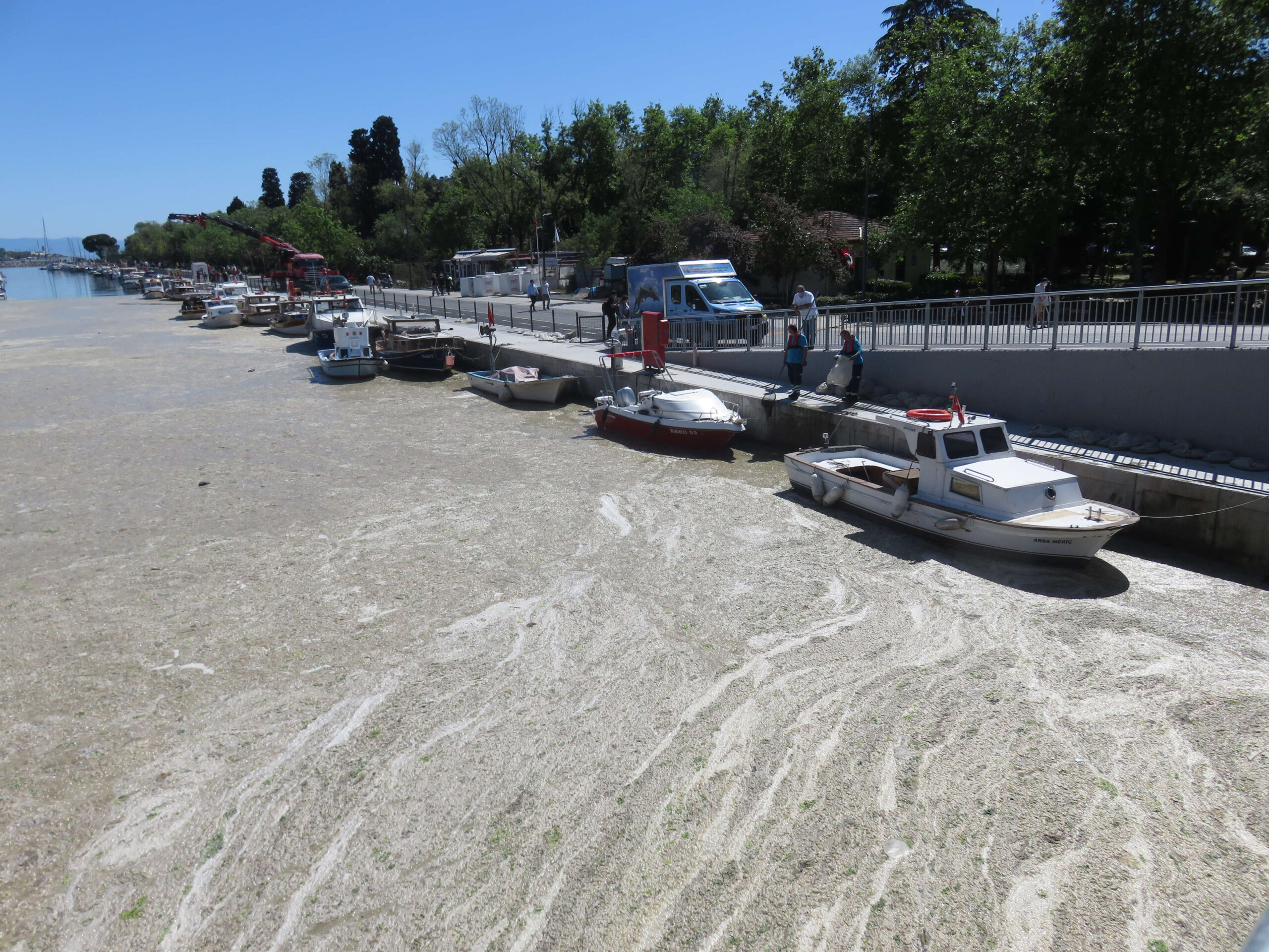 Beton dökülmüş gibi tabaka oluşturan salya teknelerin bulunduğu kısımda yoğunlaştı. Kötü kokular yayan deniz salyalarının oluşturduğu kirlilik havadan da görüntülendi. Kurbağalıdere’yi geçtiğimiz günlerde de deniz salyası sarmıştı.