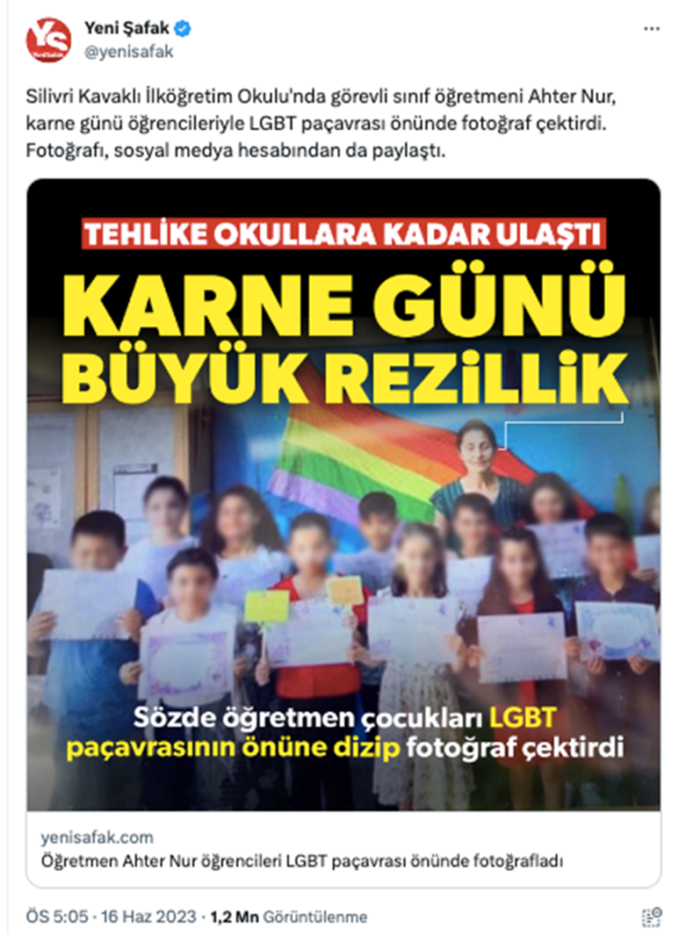Yeni Şafak gazetesi fotoğrafı; “Tehlike okullara kadar ulaştı, karne günü büyük rezillik. Silivri Kavaklı İlköğretim Okulu’nda görevli ‘Ahter Nur’ isimli öğretmen karne günü küçük yaştaki öğrencilere LGBT paçavrasının önünde fotoğraf çektirdi”, Sabah Gazetesi “LGBT terörü: Sınıf öğretmeninden büyük skandal çocukları sapkınlığa alet etti” başlıklarıyla haber yaptı.