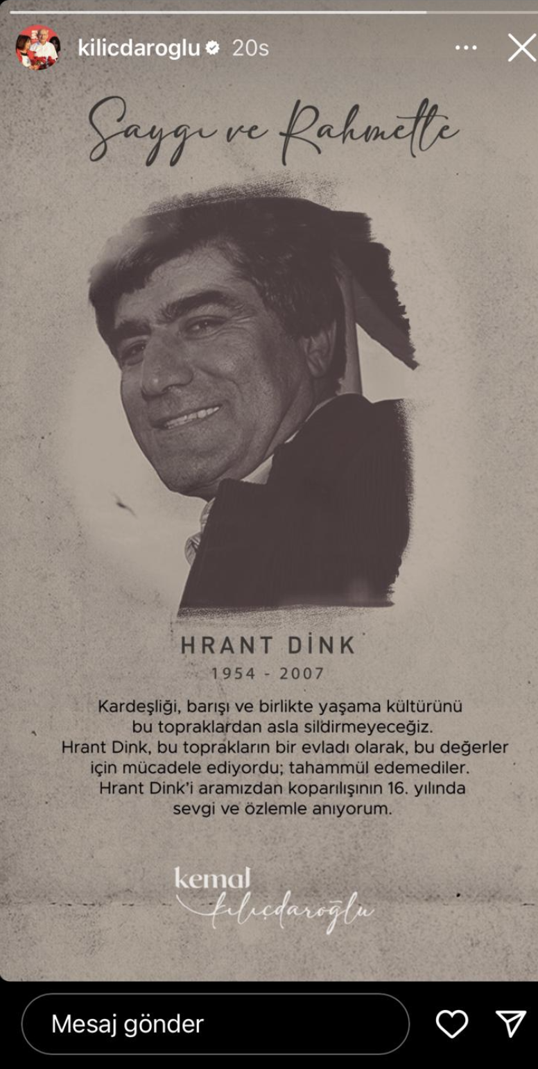 Altılı Masa’dan sadece CHP Genel Başkanı Kemal Kılıçdaroğlu Instagram hesabı üzerinden bir story paylaşarak Hrant Dink’i andı. Kılıçdaroğlu Twitter hesabından bir paylaşım yapmadı.