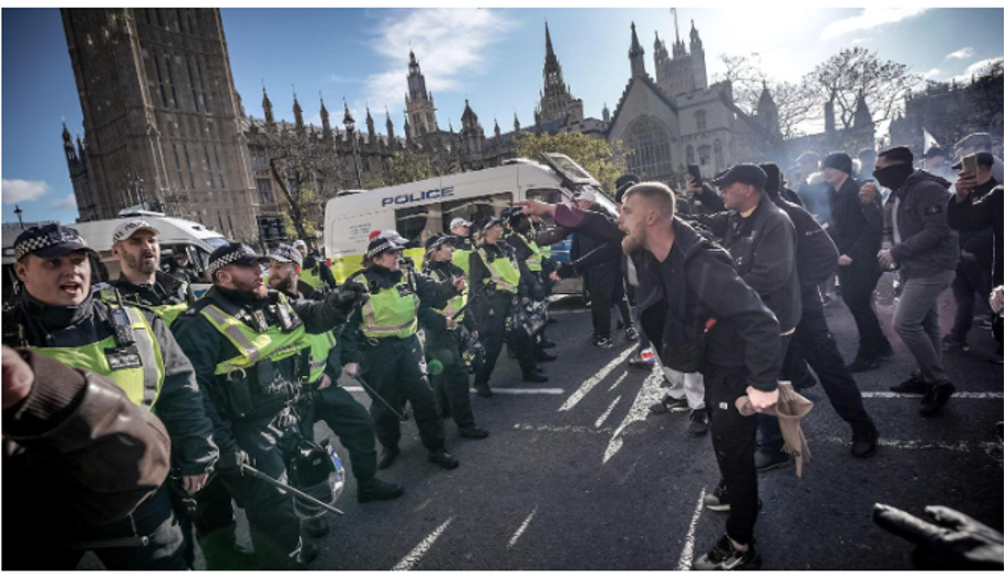 Çatışmalar, sabah saat 10.00 sularında, polis, İngiliz bayrakları taşıyan kalabalığın Embankment boyunca 103 yıllık savaş anıtı Cenotaph’ın bulunduğu Whitehall’a doğru yürüyüşünü durdurmaya çalışırken patlak verdi.