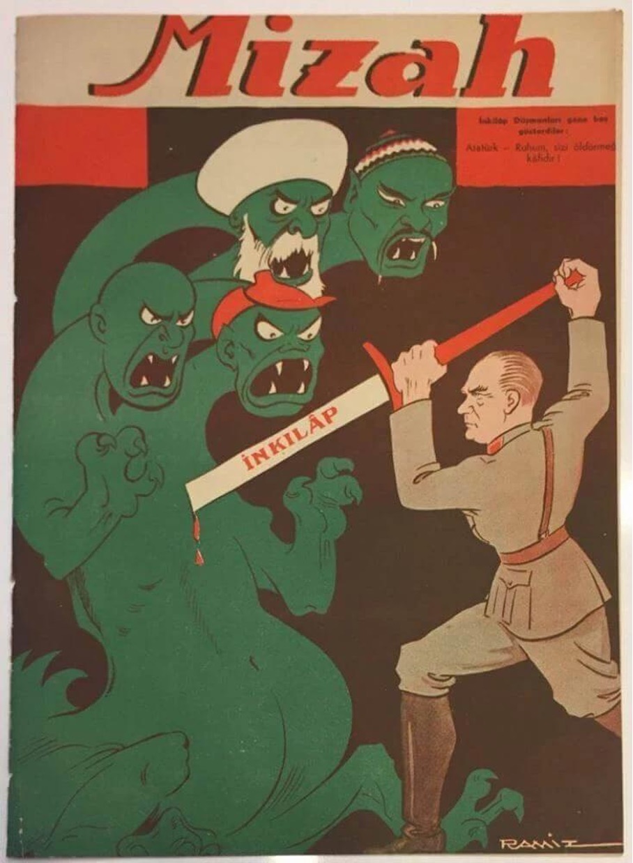 Ramiz Gökçe’nin Mizah Dergisi’nde 13 Haziran 1947 günü yayımlanan karikatüründe Atatürk “inkılâp kılıcı”nı yeşil dört başlı bir canavara saplıyor. Canavarın dört başı birbirinden farklı; sarıklı, saçsız, kızıl şapkalı ve çekik gözlü.