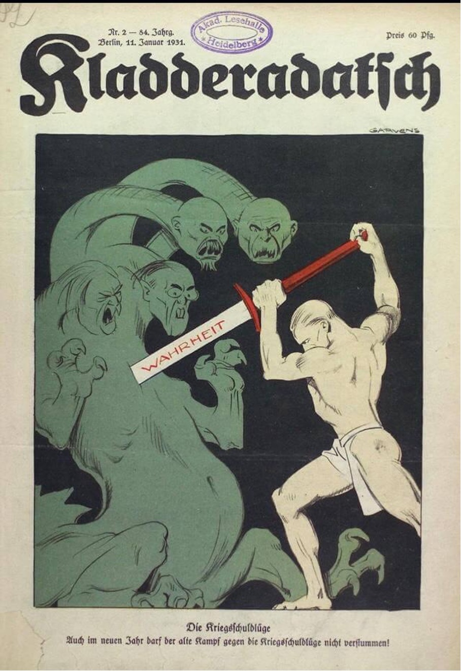 Adı geçen dergide “gerçek” (“wahrheit”) yazılı kılıcını Lloyd George, Wilson, Clemenceau ve Poincaré’in suretlerini barındıran “savaş suçu yalanı”nı temsil eden 4 başlı yaratığa saplayan bir Alman resmedilmiş.