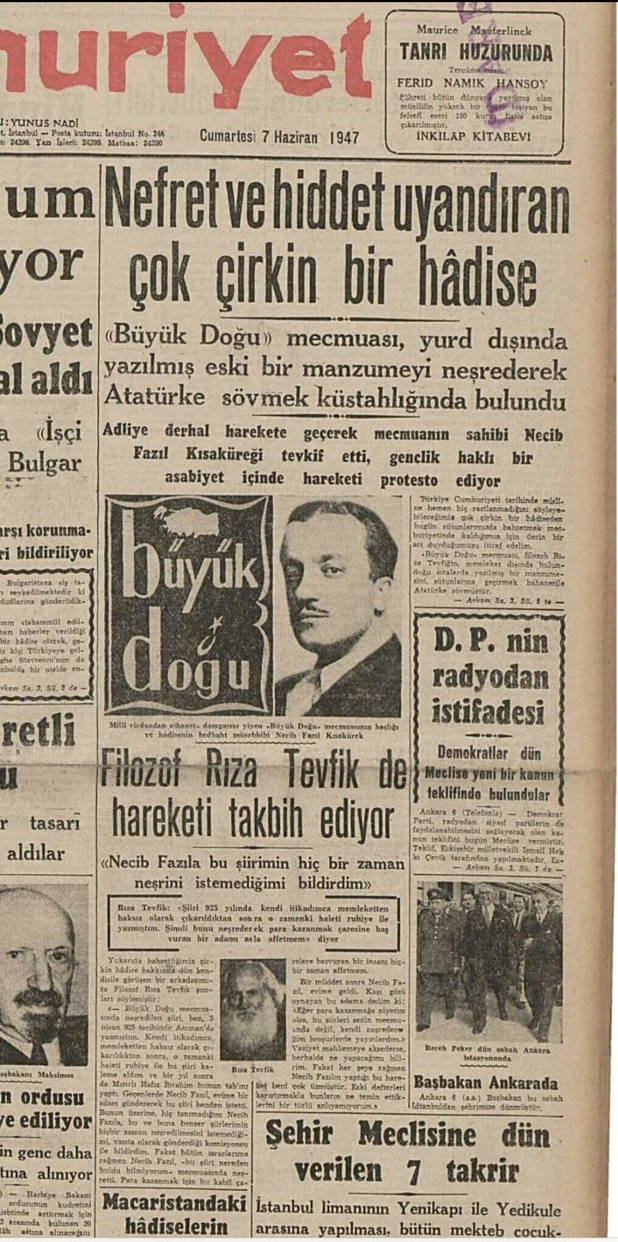 Mizah dergisinin 13 Haziran 1947 tarihli sayısının “İnkılap düşmanları yine baş gösterdiler” “Atatürk – ruhum sizi öldürmeğe kâfidir” notuyla çıkmıştı.