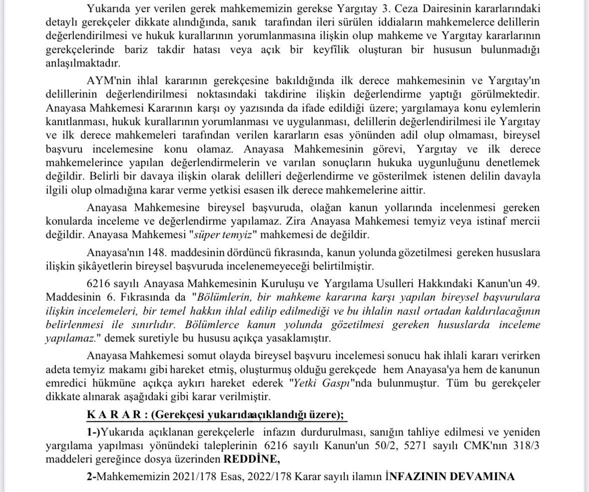 Anayasa Mahkemesi somut olayda bireysel başvuru incelemesi sonucu hak ihlali kararı verirken adeta temyiz makamı gibi hareket etmiş, oluşturmuş olduğu gerekçede hem Anayasa’ya hem de kanunun emredici hükümlerine açıkça aykırı hareket ederek “Yetki Gasbı”nda bulunmuştur. Tüm bu gerekçeler birlikte alındığında aşağıdaki gibi karar verilmiştir.”