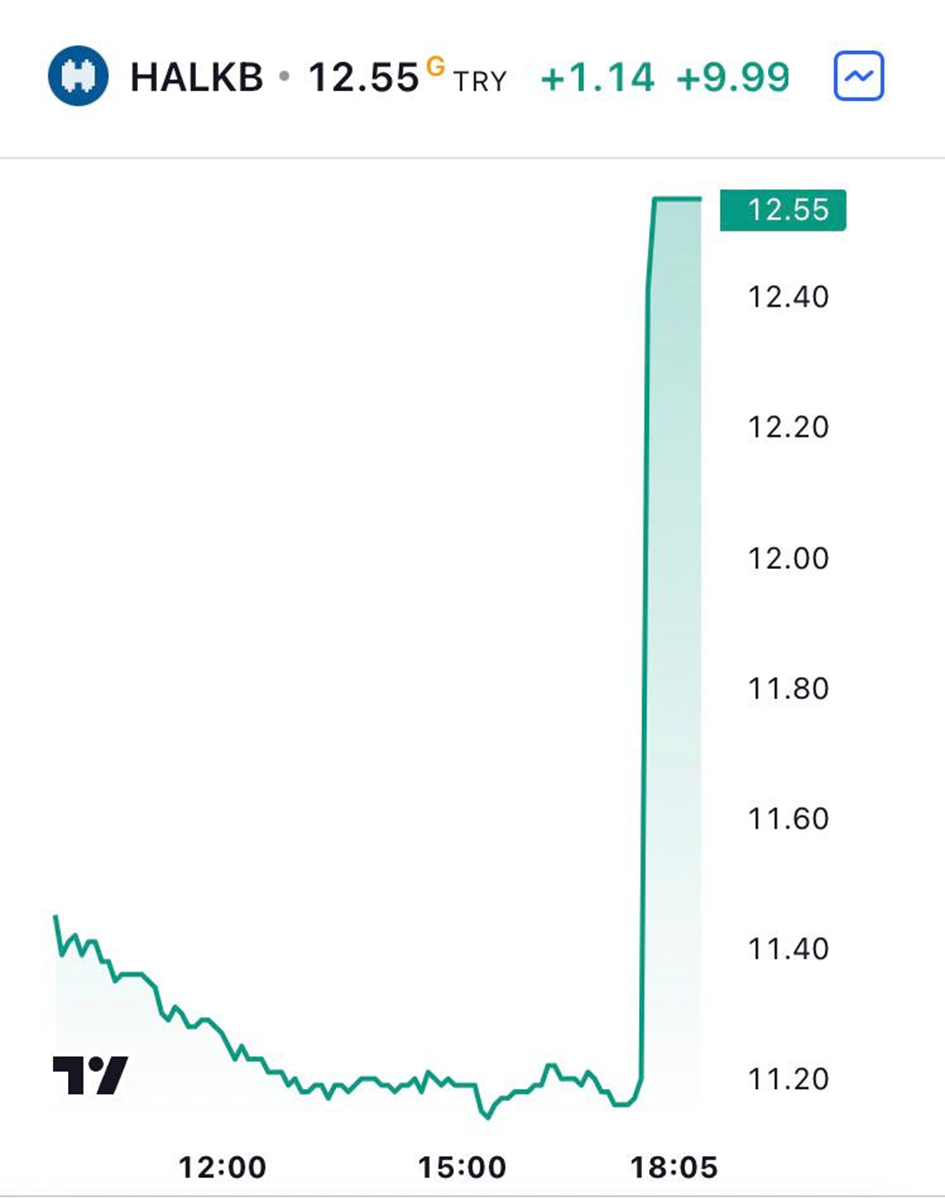 Bu haberin duyulması üzerine Halkbank hisseleri Borsa İstanbul’da yüzde 9,9 yükseldi ve 12,55 lira ile tavan oldu. Halkbank’ın yanı sıra hisseleri Borsa İstanbul’da işlem gören bir diğer kamu bankası olan Vakıfbank da günü yüzde 9,93 değer kazanarak 10,30 TL’den kapattı. Halkbank’la ilgili bu haber bankacılık endeksinin de günü yüzde 3,60 oranında yükselişle 4,709 puandan tamamlamasına neden oldu.