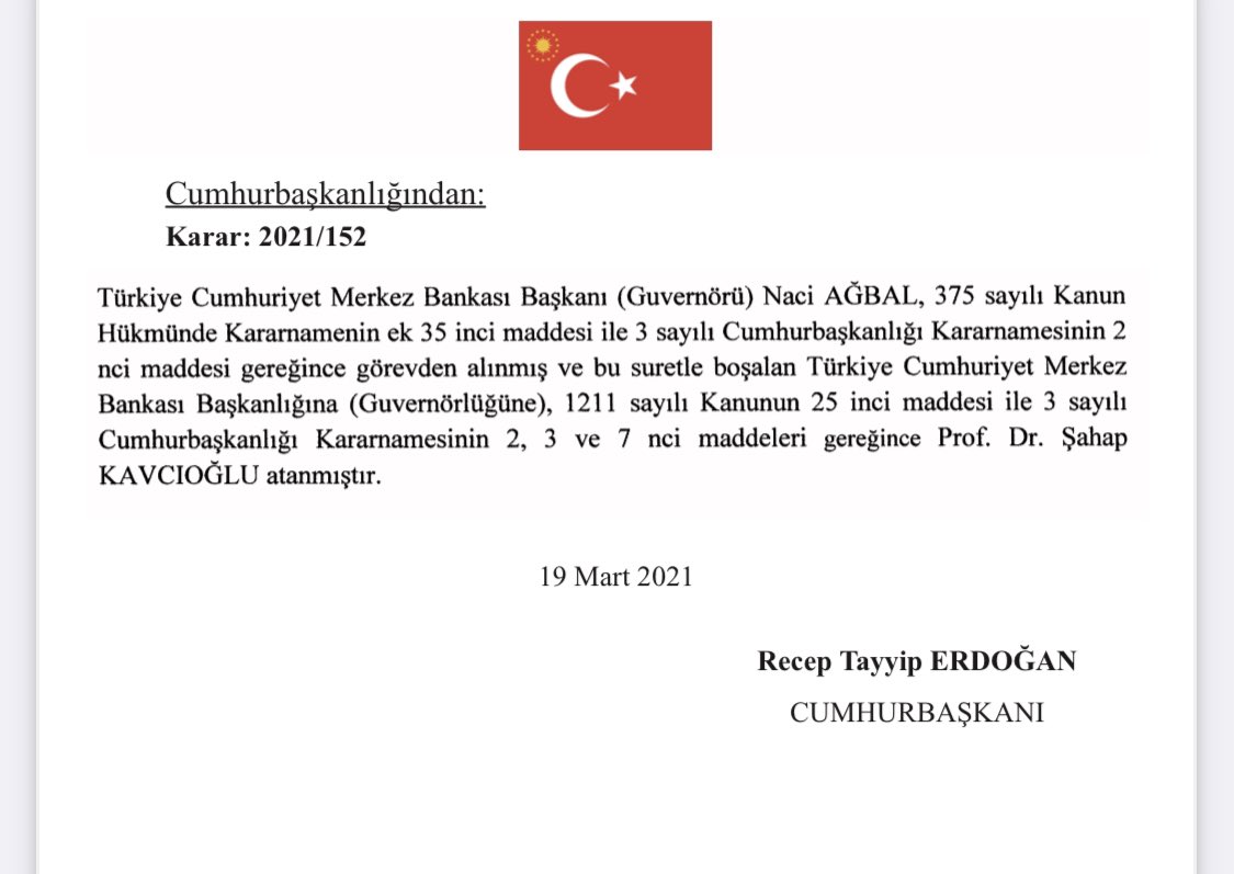 Resmi Gazete'de yer alan Cumhurbaşkanı Kararı ile Merkez Bankası Başkanı Naci Ağbal görevden alınırken, yerine eski AK Parti Milletvekili ve Yeni Şafak gazetesi köşe yazarı Prof. Dr. Şahap Kavcıoğlu atandı. Böylece, cumhuriyet tarihinde ilk kez 20 ayda 4 Merkez Bankası Başkanı atanmış oldu.