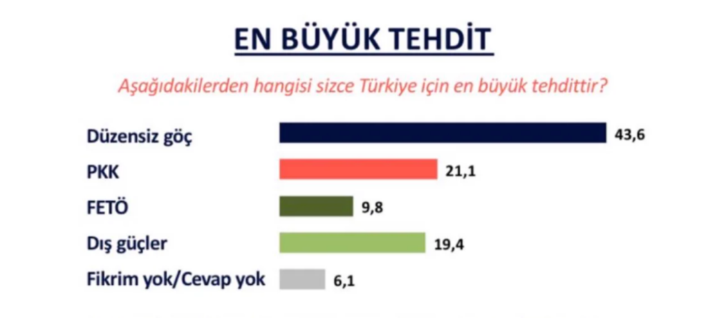 +/- 2,30 hata payı ile CATI (Bilgisayar destekli telefonda anket) yöntemiyle yapılan ankete göre en büyük tehdit olarak yüzde 43,6 ile düzensiz göç görülüyor. Ardından yüzde 21,1 ile PKK ve yüzde 19,1 ile dış güçler geliyor. Yüzde 9,8 ise en büyük tehdit sorusuna “FETÖ” yanıtını verdi.
