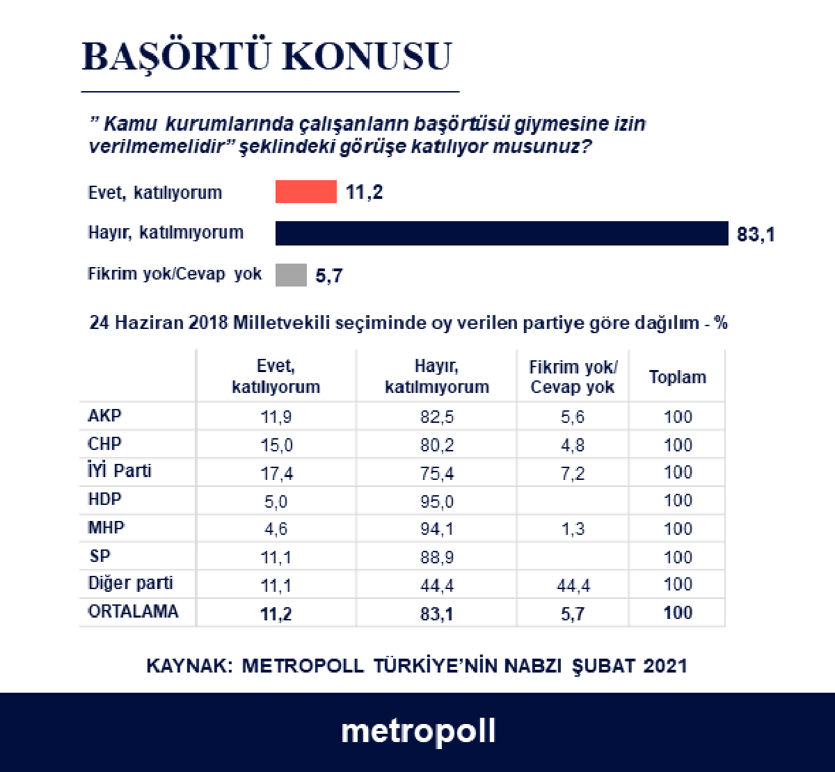 Buna göre, CHP’lilerin yüzde 80’i, AK Partililerin de yüzde 82’si “Kamu kurumlarında çalışanlar başörtüsü takmamalıdır” yaklaşıma karşı.