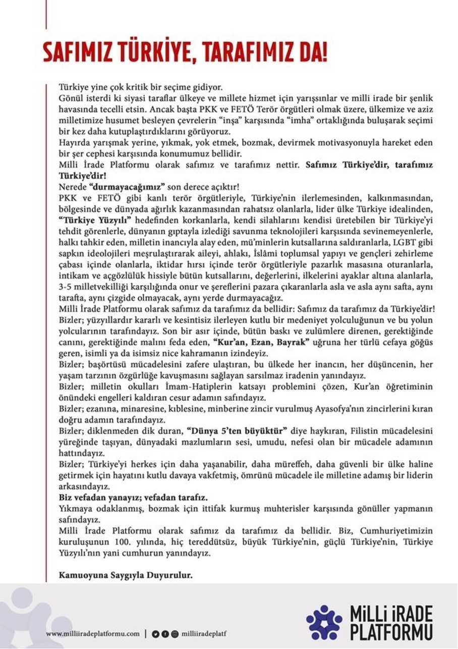 2013 yılında dershane tartışmalarının ilk alevlendiği günlerde, muhafazakar 100 sivil toplum kuruluşunun Gülencilere karşı AK Parti’ye destek vermek için bir araya gelmesi ve ‘Milli İrade Bildirisi‘ni imzalamasıyla kurulan “Milli İrade Platformu”ndan, 14 Mayıs seçimleri öncesi Cumhur İttifakı ve Erdoğan’a destek açıklaması geldi.