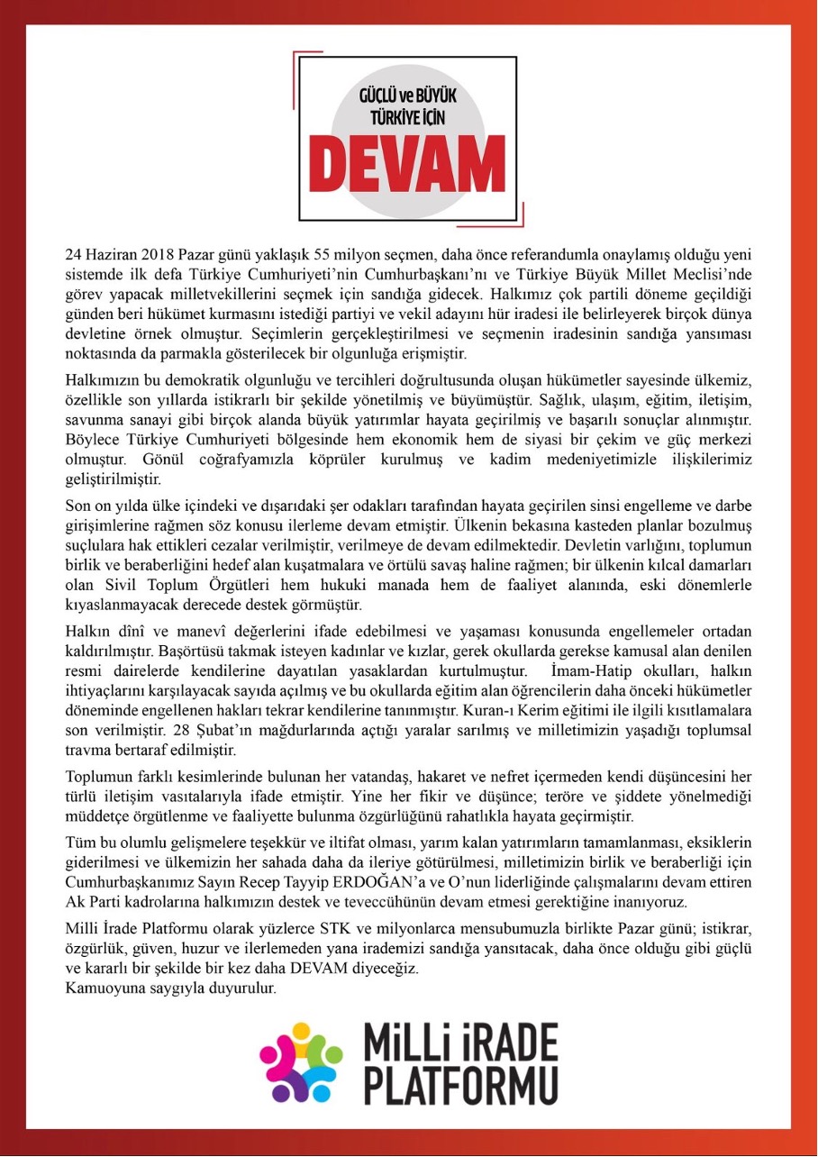 2018 seçimlerinde “Güçlü ve büyük Türkiye için DEVAM” başlığıyla yayınlanan bildiri. Bildirinin imzacıları platformun internet sitesinde sıralanmıştı.