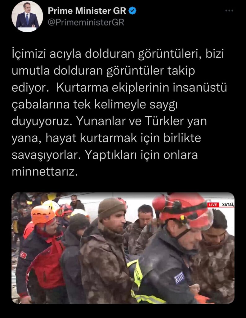 Yunanistan Başbakanı Miçotakis, sosyal medya hesabından Türkçe mesaj paylaştı: "İçimizi acıyla dolduran görüntüleri, bizi umutla dolduran görüntüler takip ediyor. Kurtarma ekiplerinin insanüstü çabalarına tek kelimeyle saygı duyuyoruz. Yunanlar ve Türkler yan yana, hayat kurtarmak için birlikte savaşıyorlar. Yaptıkları için onlara minnettarız."