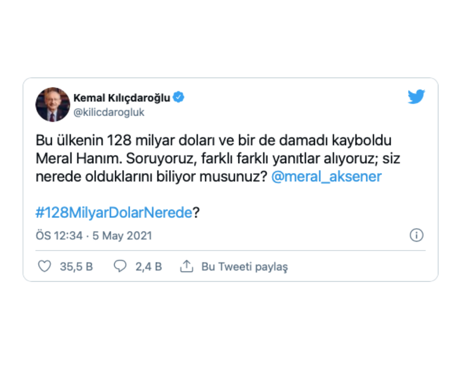 CHP Genel Başkanı Kemal Kılıçdaroğlu, İYİ Parti Genel Başkanı Meral Akşener’i etiketleyerek yaptığı paylaşımda “Bu ülkenin 128 milyar doları ve bir de damadı kayboldu Meral Hanım. Soruyoruz, farklı farklı yanıtlar alıyoruz; siz nerede olduklarını biliyor musunuz?” ifadelerini kullandı.