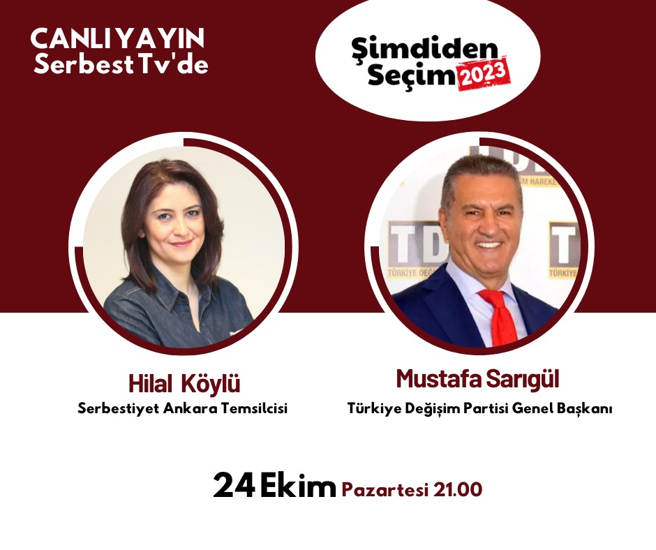 Türkiye Değişim Partisi Genel Başkanı Mustafa Sarıgül, Serbestiyet Ankara Temsilcisi Hilal Köylü'nün hazırlayıp sunduğu Şimdiden Seçim 2023 programına konuk olacak. Hilal Köylü ile Şimdiden Seçim 2023, bu akşam (24 Ekim Pazartesi) saat 21.00'den itibaren canlı yayınla Serbest TV'de.