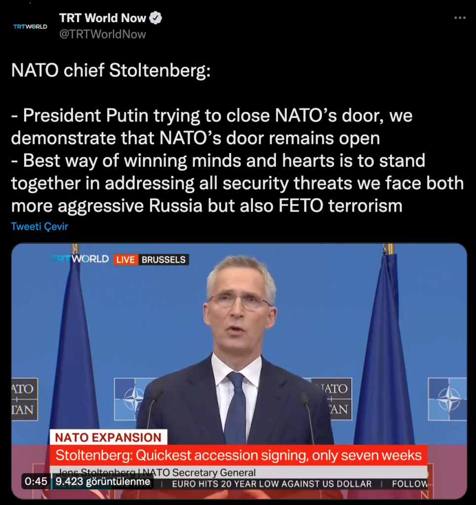 Önce TRT World, Stoltenberg’in birza hızlı kullandığı bu “threat of terrorism” (terörizm tehdidi) ifadesinin “threat of…” kısmını FETO gibi anladı ve “FETO tehdidi” olarak haberleştirdi.