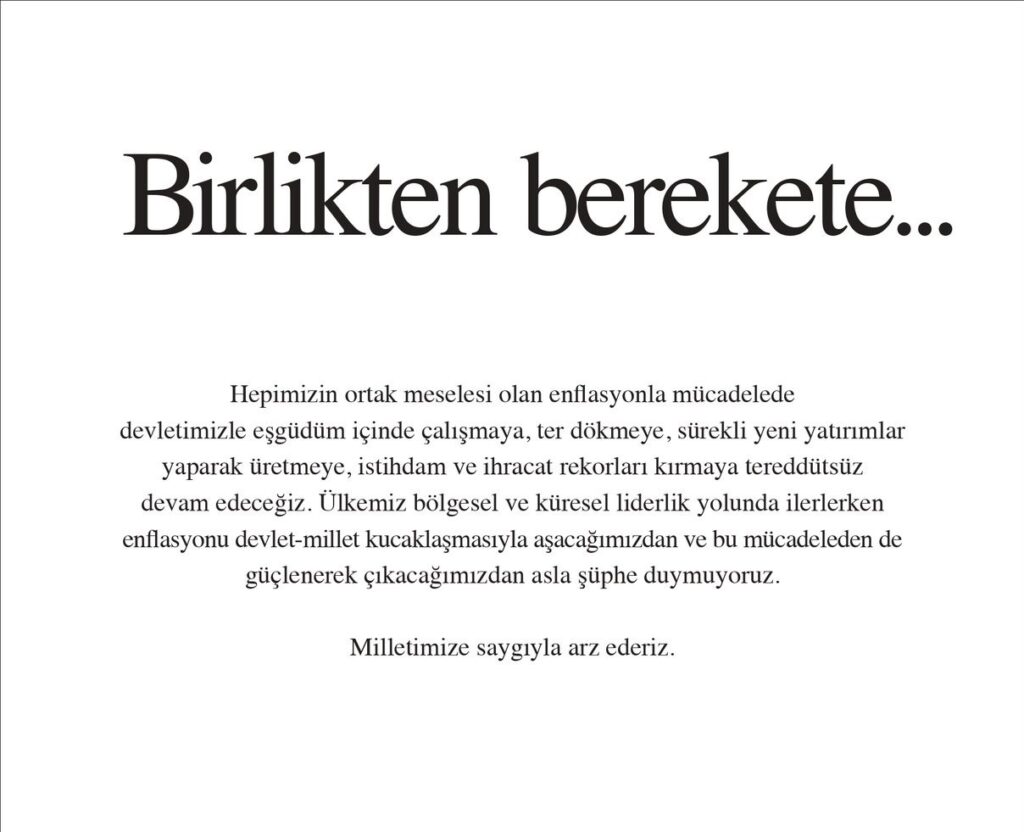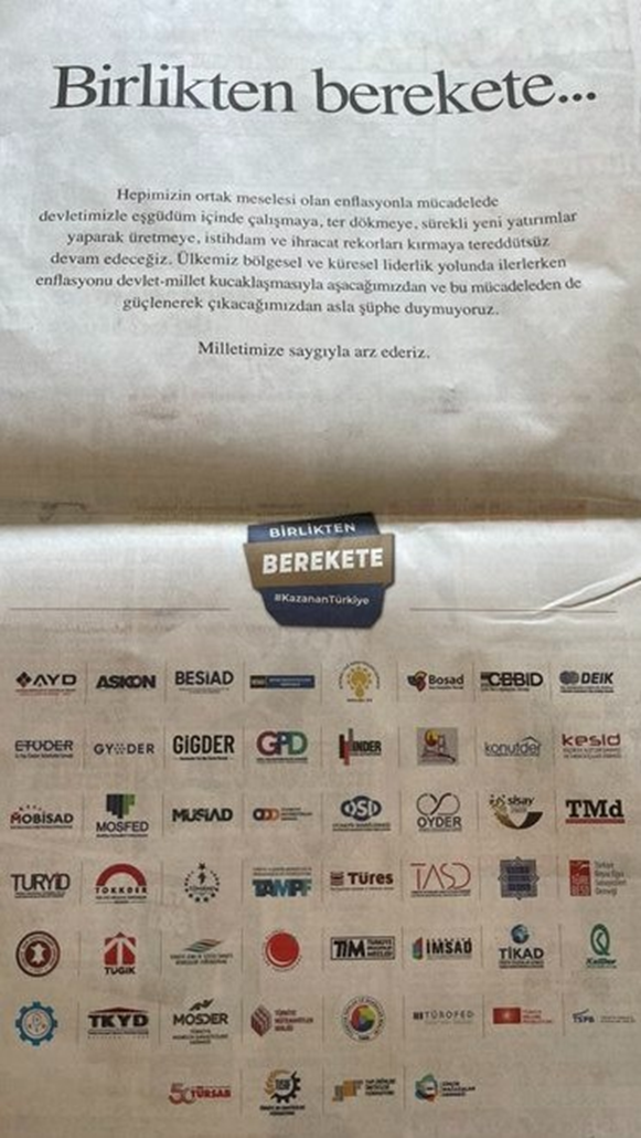 Türkiye Odalar ve Borsalar Birliği, Türkiye İhracatçılar Meclisi, MÜSİAD’ın da aralarında bulunduğu işveren dernekleri, Hazine ve Maliye Bakanı Nureddin Nebati’nin duyurduğu “Enflasyonla Mücadelede Birlikten Berekete” programına destek için gazetelere ilan verdi. Ortak ilanda “Hepimizin ortak meselesi olan enflasyonla mücadelede devletimizle eş güdüm içinde çalışmaya, ter dökmeye, sürekli yeni yatırımlar yaparak üretmeye, istihdam ve ihracat rekorları kırmaya tereddütsüz devam edeceğiz” vurgusu yer aldı.