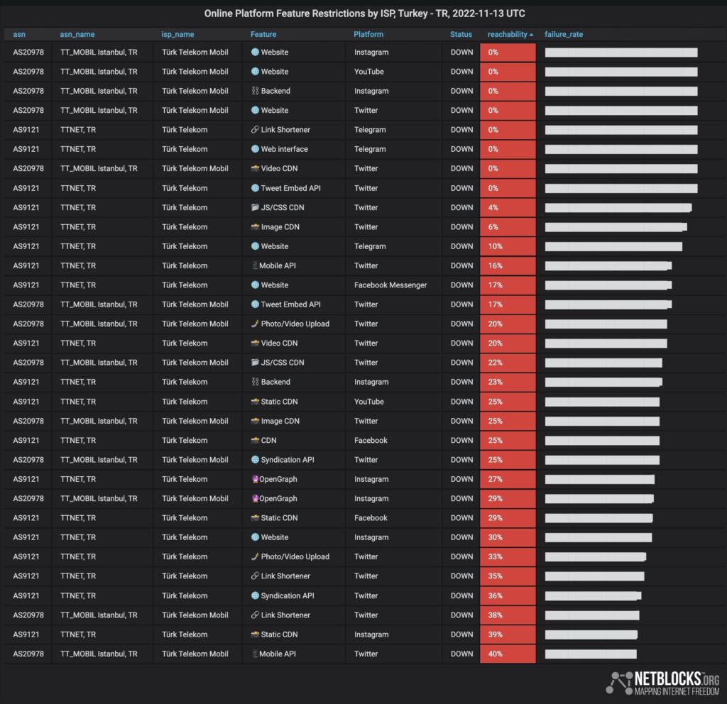 Netblocks’un ölçümüne göre, kısıtlama tedbiri ilk önce Türk Telekom’da uygulandı. Daha sonra diğer internet sağlayıcı operatörler de kısıtlamayı sürdürdü.