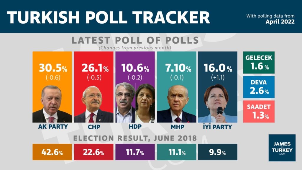Anketlerin ortalamasına göre AK Parti’nin oyu Nisan ayında %0.6 azalarak %30.5’e geriledi. CHP’nin oy oranı %0.5 azaldı ve %26.1 oldu. HDP %10.6’ya, MHP %7.10’a geriledi. İYİ Parti ise oyunu %1.1 arttırarak şimdiye kadarki en yüksek oy oranı olan %16’ya ulaştı.