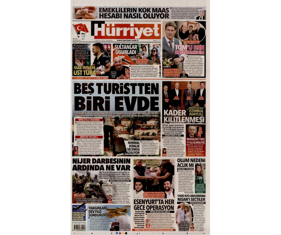 Hürriyet Gazetesi dünkü (2 Ağustos) birinci sayfasında “Beş turistten biri evde” manşeti attı.