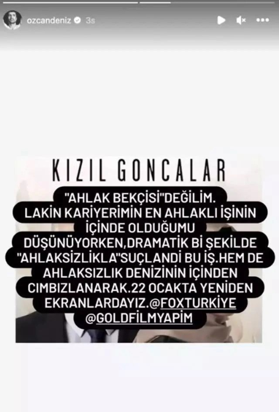 “Ahlak bekçisi değilim. Lakin kariyerimin en ahlaklı işinin içinde olduğumu düşünüyorken, dramatik bir şekilde ahlaksızlıkla suçlandı bu iş. Hem de ahlaksızlık denizinin içinden cımbızlanarak. 22 Ocak’ta yeniden ekranlardayız.”