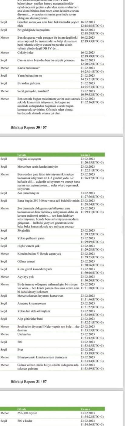 Ayrıca aynı bilirkişi raporunda Seçil Erzan’ın başka mağdurlarla mesajlaşmasının ise ekran görüntüleri yer aldı. Ekran görüntüsü bulunan mesajlaşmalardan biri de ünlü futbolcu Arda Turan’a ait. Mesajlaşmada Arda Turan’ın Seçil Erzan’a “Seçil ne yaptın bana, bunu nasıl yaparsın? Beni insanlara nasıl rezil edersin? Senin için gittim borçlar istedim. Sözler verdim hiçbirini tutamıyorum. Bana bunu yapacağın ne yaptım ben. İnsanların gözünde ne hale düştü” dediği Seçil Erzan’ın ise “Ne desen haklısın şu an çok ama çok özür dilerim” diye karşılık verdiği görüldü.