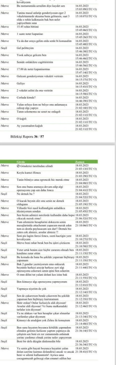 Raporda yer alan Whatsapp mesajlaşmalarında, Erzan’ın olayın ortaya çıkmasından üç ay önce, 11 Ocak 2023 tarihinde Diba adlı bir kişiye “Üstlerime bilgi vermem gereken bir konu vardı vermedim. Onlar da fark etti. Bir de onu çözmem gerekiyor şimdi. Konu çok önemli bu işlerle bağlantılı. Oradan da bir sorun çıkarsa her şey patlar. Onlara bir şey vermem gerekmiyor fark ettiler onlardan habersiz iş yaptığımı. Olayı büyütürlerse çok kötü olur” diye mesaj attığı görülüyor.