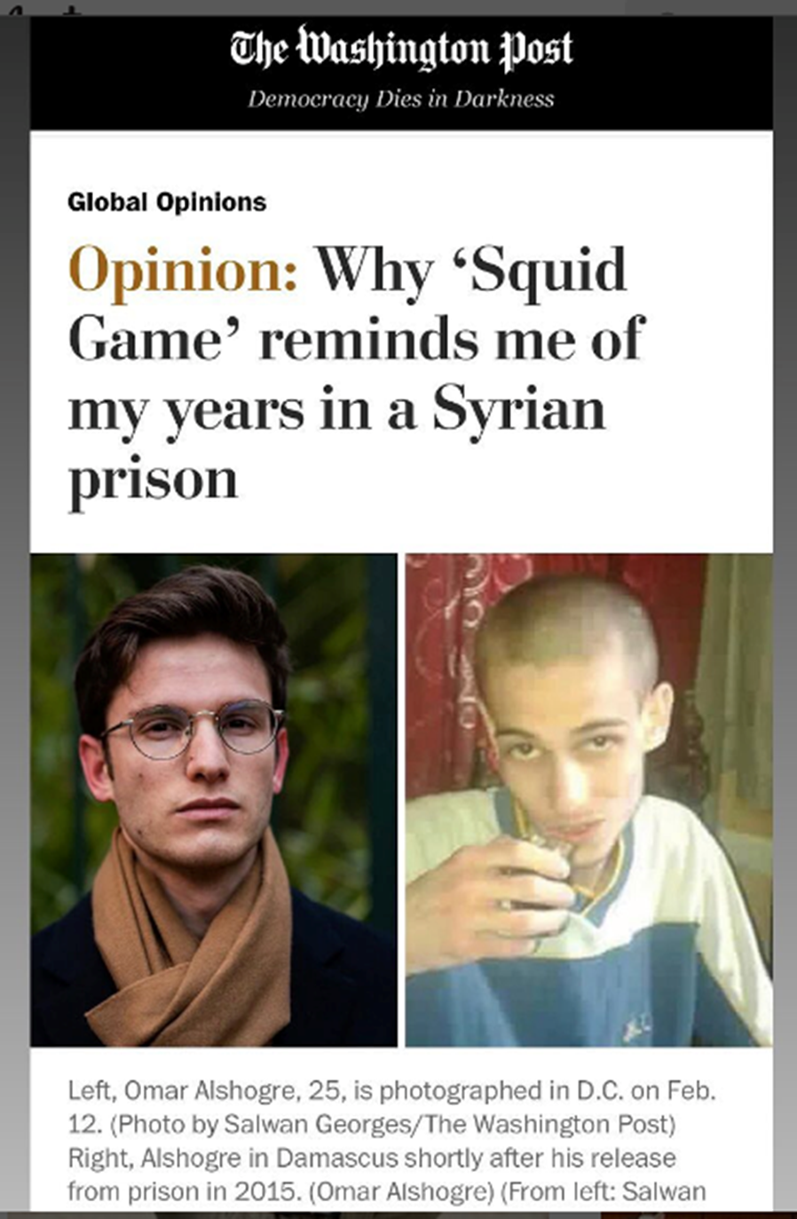 En son Washington Post’a “Squid Game neden bana Suriye’de hapishanede geçen yıllarımı hatırlatıyor” başlıklı bir yazı yazmıştı.
