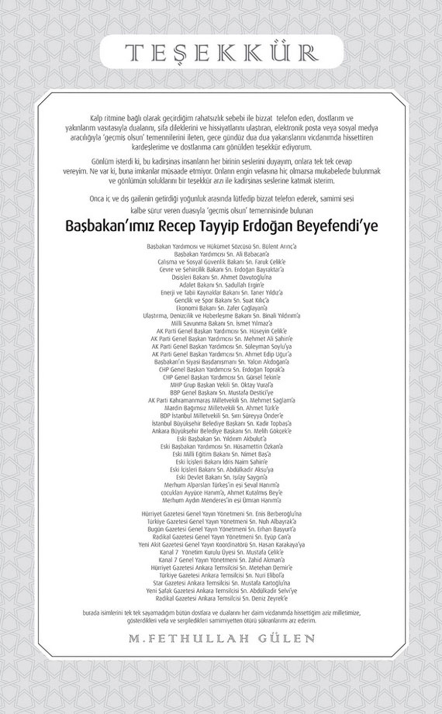 Gülen ikinci ilanında Cumhurbaşkanı Gül başta olmak üzere Meclis başkanı, sivil toplum ve iş dünyasından isimlere teşekkür etmişti.