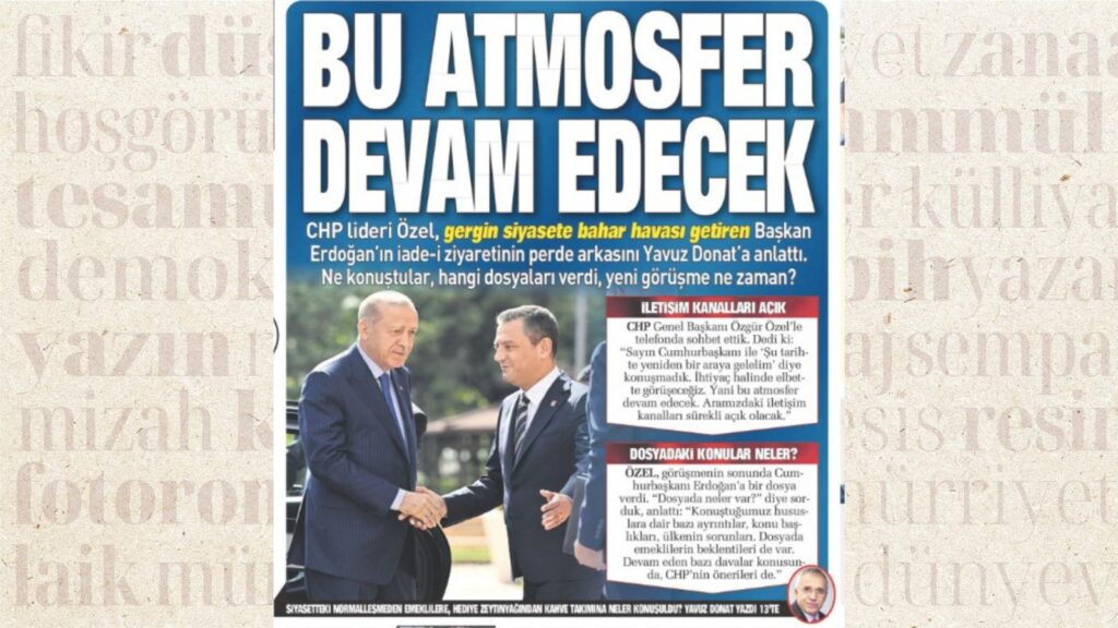 Özel’in, “Sayın Cumhurbaşkanı ile ‘Şu tarihte yeniden bir araya gelelim’ diye konuşmadık… İhtiyaç halinde elbette görüşeceğiz… Yani bu atmosfer devam edecek… Aramızdaki iletişim kanalları sürekli açık olacak” dediğini aktaran Donat, Erdoğan’ın Özel’e verdiği hediyelere de yazısında yer verdi. Donat, Erdoğan’ın Özel’e ‘acı’, ‘yarım acı’ ve ‘yumuşak’ zeytinyağları götürdüğünü yazdı.