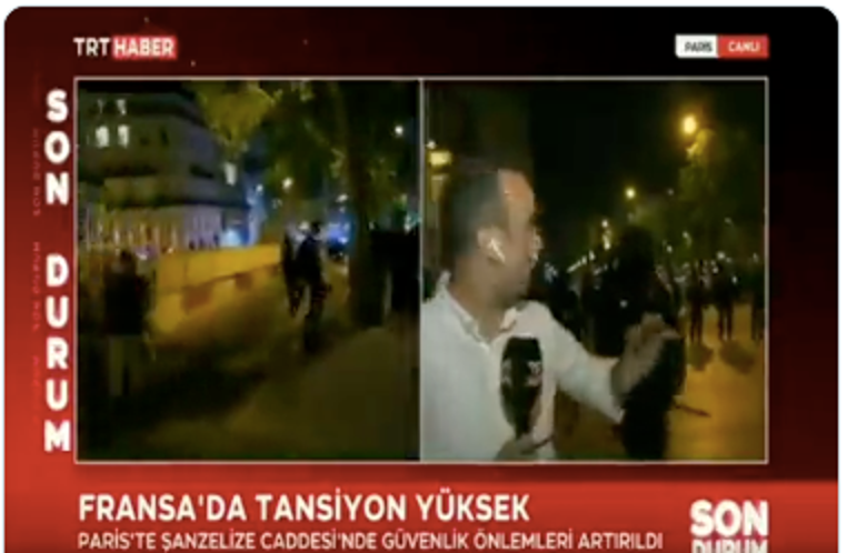 TRT’nin Brüksel temsilcisi Mustafa Seçen, Paris’ten canlı yayındayken bir Fransız polisi kendisine Türkçe ‘kenara çekil’ dedi. Bu anlar canlı yayına yansıdı.