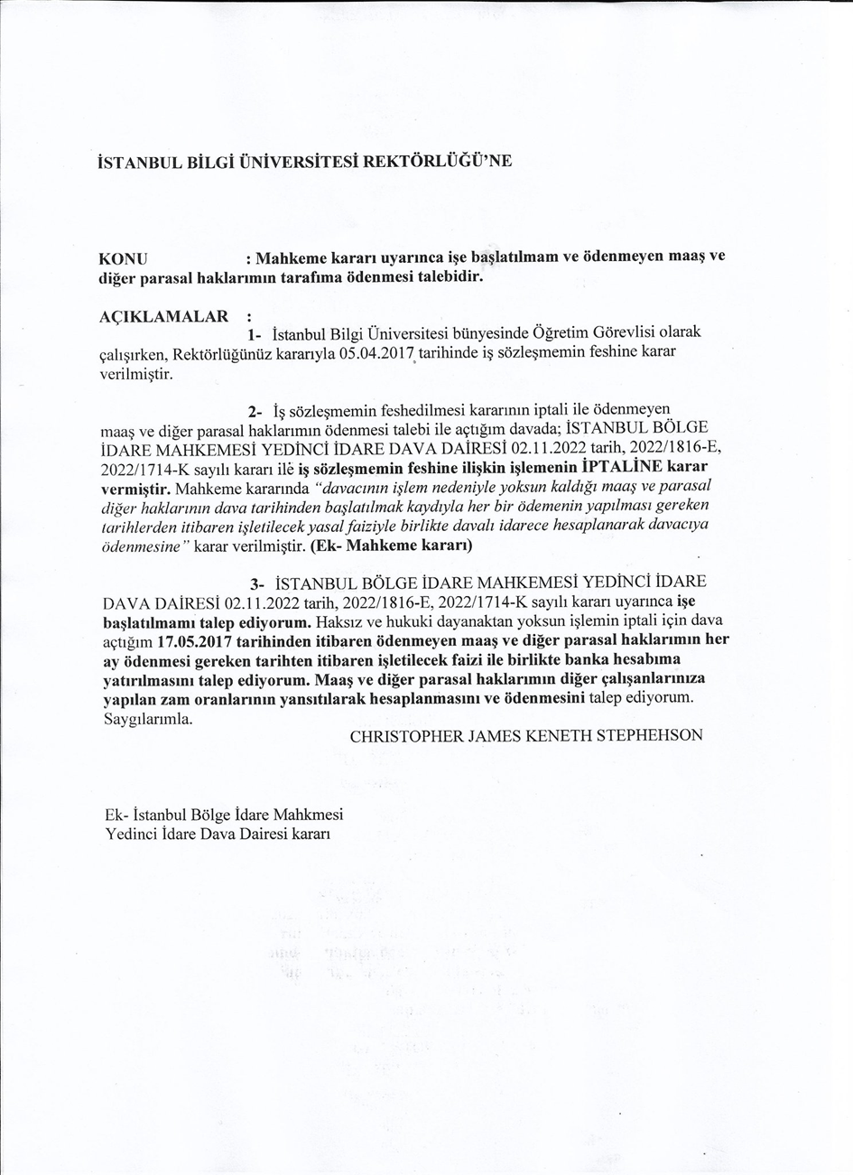 Bugün (8 Aralık) Twitter hesabından bir paylaşımda bulunan Chris Stephenson, beş buçuk yıllık hukuk mücadelesinin ardından Bilgi Üniversitesi’ndeki görevine geri döndüğünü açıkladı.