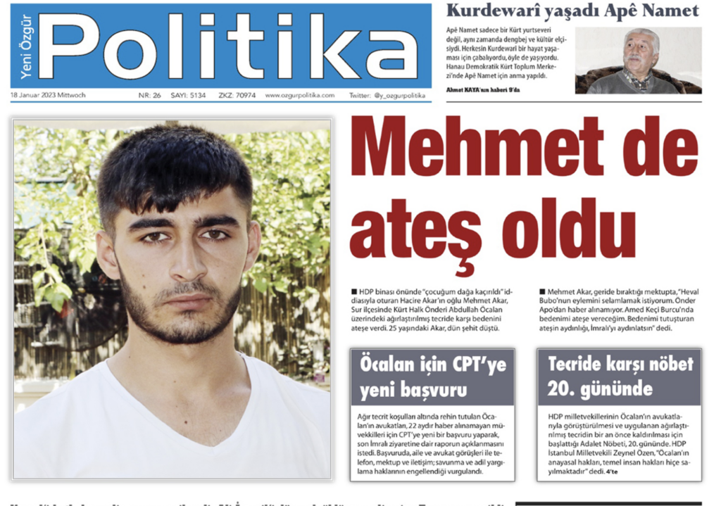 Yeni Özgür Politika Gazetesi’nin Mehmet Akar’la ilgili manşetten verdiği haberde, “HDP binası önünde ‘çocuğum dağa kaçırıldı’ iddiasıyla oturan Hacire Akar’ın oğlu Mehmet Akar, Sur ilçesinde Kürt Halk Önderi Abdullah Öcalan üzerindeki ağırlaştırılmış tecride karşı bedenini ateşe verdi. 25 yaşındaki Akar, şehit düştü” spotunu kullandı.