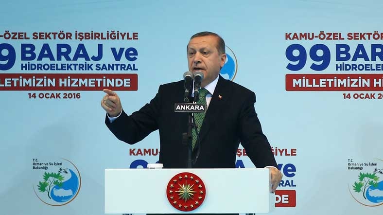 Cumhurbaşkanı Recep Tayyip Erdoğan, Ankara’daki Arena Spor Salonu'nda, kamu-özel sektör tarafından tamamlanan 99 baraj ve hidroelektrik santralinin toplu açılış törenine katıldı. Güneydoğu'daki çatışmaların durması için bildiri yayımlayan akademisyenleri eleştirdi: