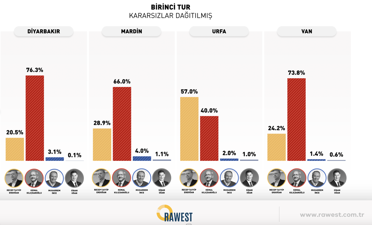 Anketin sonuçlarına göre Cumhurbaşkanlığı seçimi ikinci tura kalıyor, Diyarbakır, Mardin, Urfa ve Van’da ise Kılıçdaroğlu ilk turda yüzde 62,4 oranında oy alıyor.