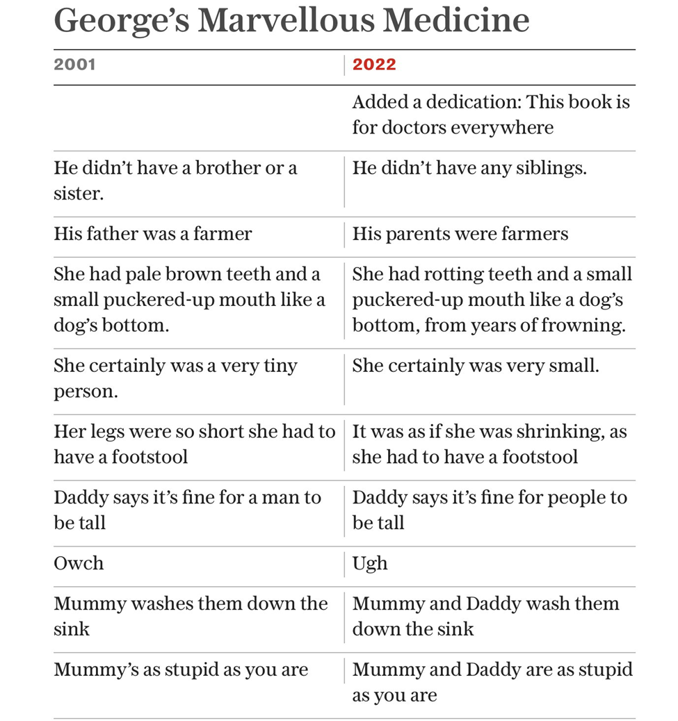 Çocuk kitaplarıyla bilinen ünlü İngiliz romancı Roald Dahl’ın kitaplarının 2020 yılından itibaren değiştirildiği ortaya çıktı. The Telegraph’ın haberine göre, kitapların yeni basımından çirkin, şişman kelimeleri çıkarıldı, anne ve baba kelimeleri yerine ebeveyn ifadesi kullanıldı, cinsiyetçi ve dışlayıcı görülen ifadeler ayıklandı.