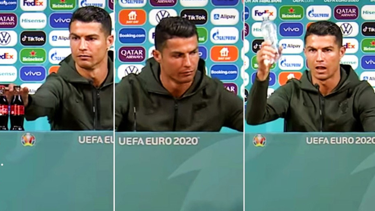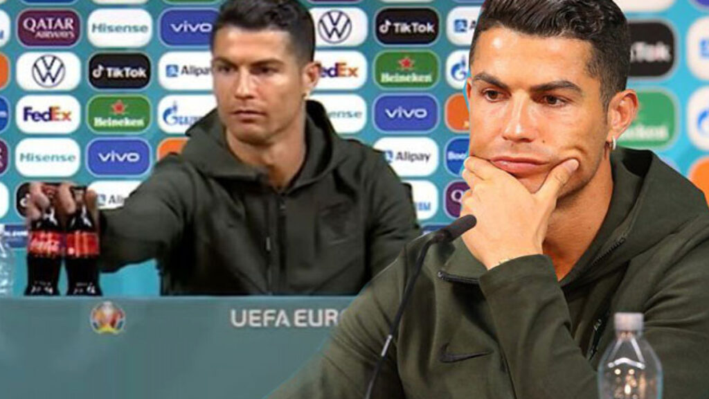 Ronaldo, Avrupa Şampiyonası’ndaki basın toplantılarında ürün yerleştirme yöntemiyle masalarda bulundurulan Coca-Cola şişelerinin yanında konuşmayı reddetti. Juventus’un yıldızı Coca-Cola şişelerini kaldırırken, elindeki suyu göstererek “Bu size yeter” dedi. Coca Cola’nın ise turnuvanın sponsorlarından olduğu anlaşıldı.