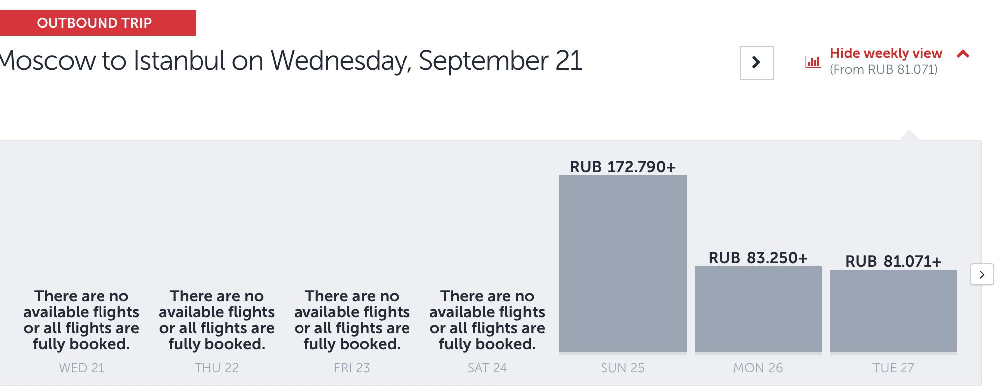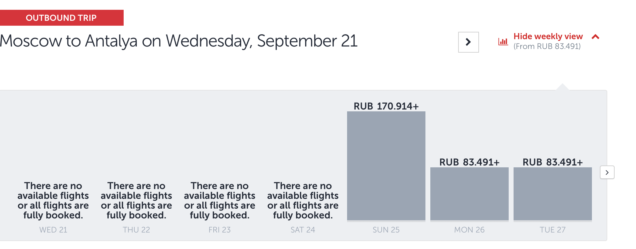 23 Eylül Cuma günü kalkacak uçak için kalan son biletler ise 83.796 ruble (25 bin TL) karşılığında satılıyor. En yakın tarihli 4 gün sonra kalkacak uçak bileti ise 170 bin ruble (51.400 TL).