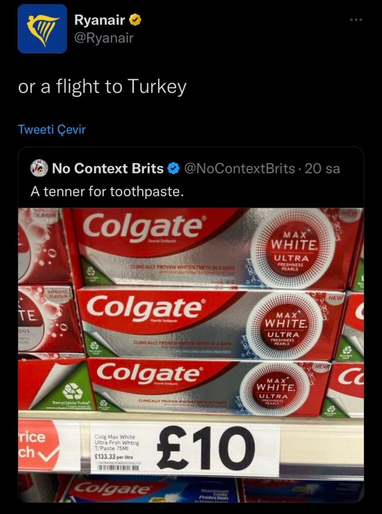 Anasayfa / Haberler / Ryan Air’den ‘üzücü’ kampanya: 10 pounda ya diş macunu ya da Türkiye’ye uçak bileti