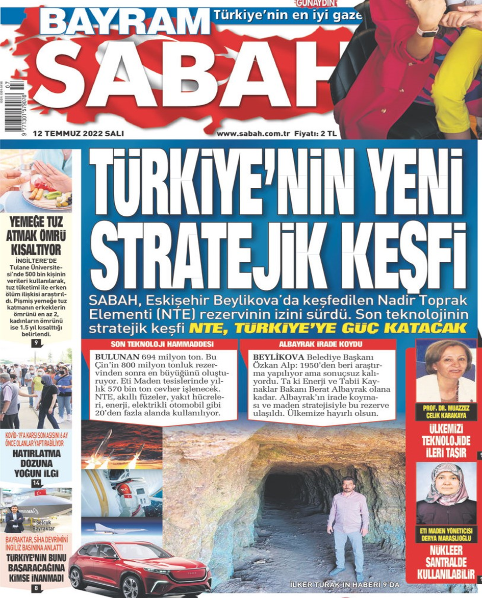 Sabah gazetesinin bugünkü (12 Temmuz) manşetinde yer alan, Eskişehir’in Beylikova ilçesinde NTE rezervi bulunduğu haberi, eski bakan Berat Albayrak’ın başarısı olarak duyuruldu.
