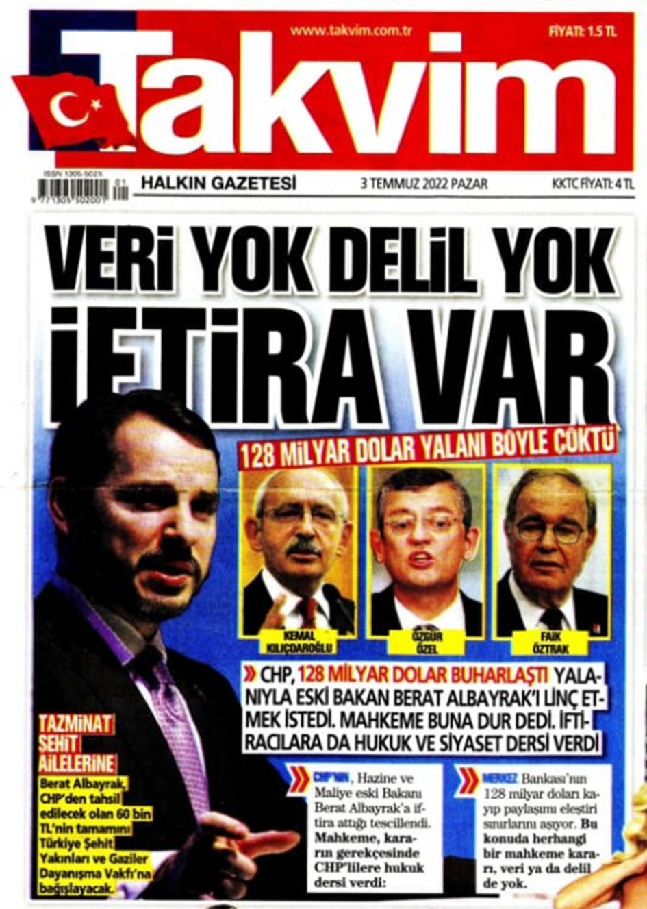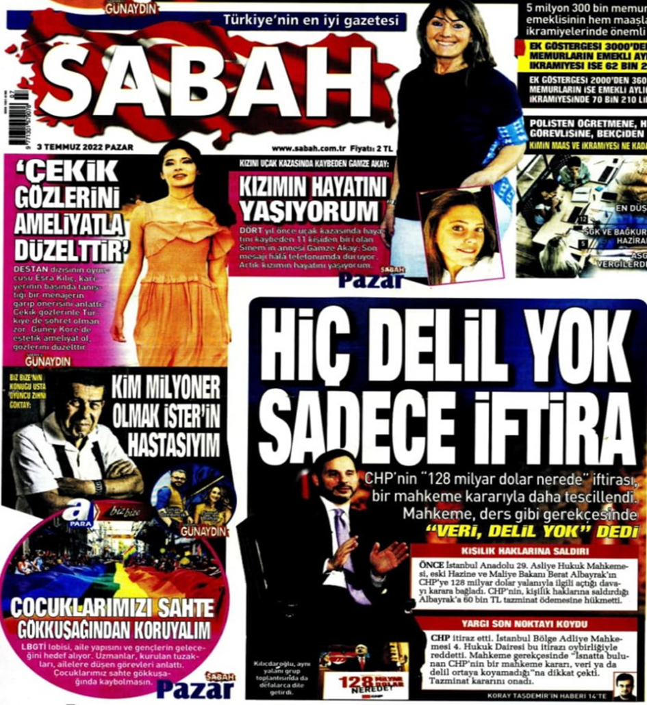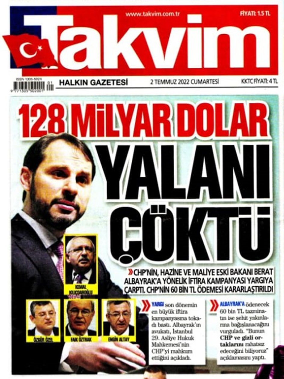 Sabah ve Turkuvaz Medya’nın diğer gazetesi Takvim, Berat Albayrak’ın “128 milyar dolar nerede” kampanyası nedeniyle CHP’ye açtığı davadan 60 bin TL tazminat kazanmasını da iki gün boyunca manşetlere çıkartmıştı.