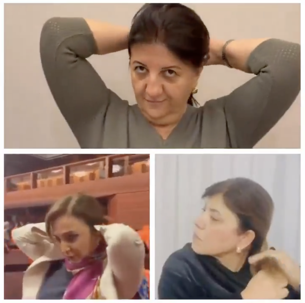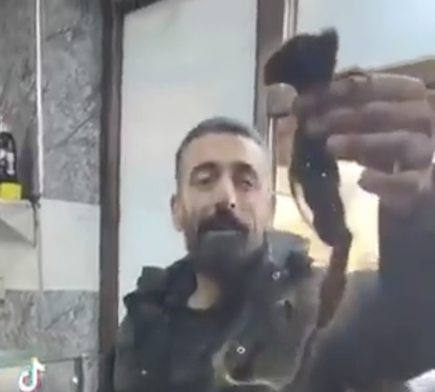 Videoda elinde bir saç örgüsü tutan bir adam, videoyu çeken kişinin, “Onu neden kestin?” sorusuna, “Zaten gitti ne yapacak ki” diye karşılık veriyor.