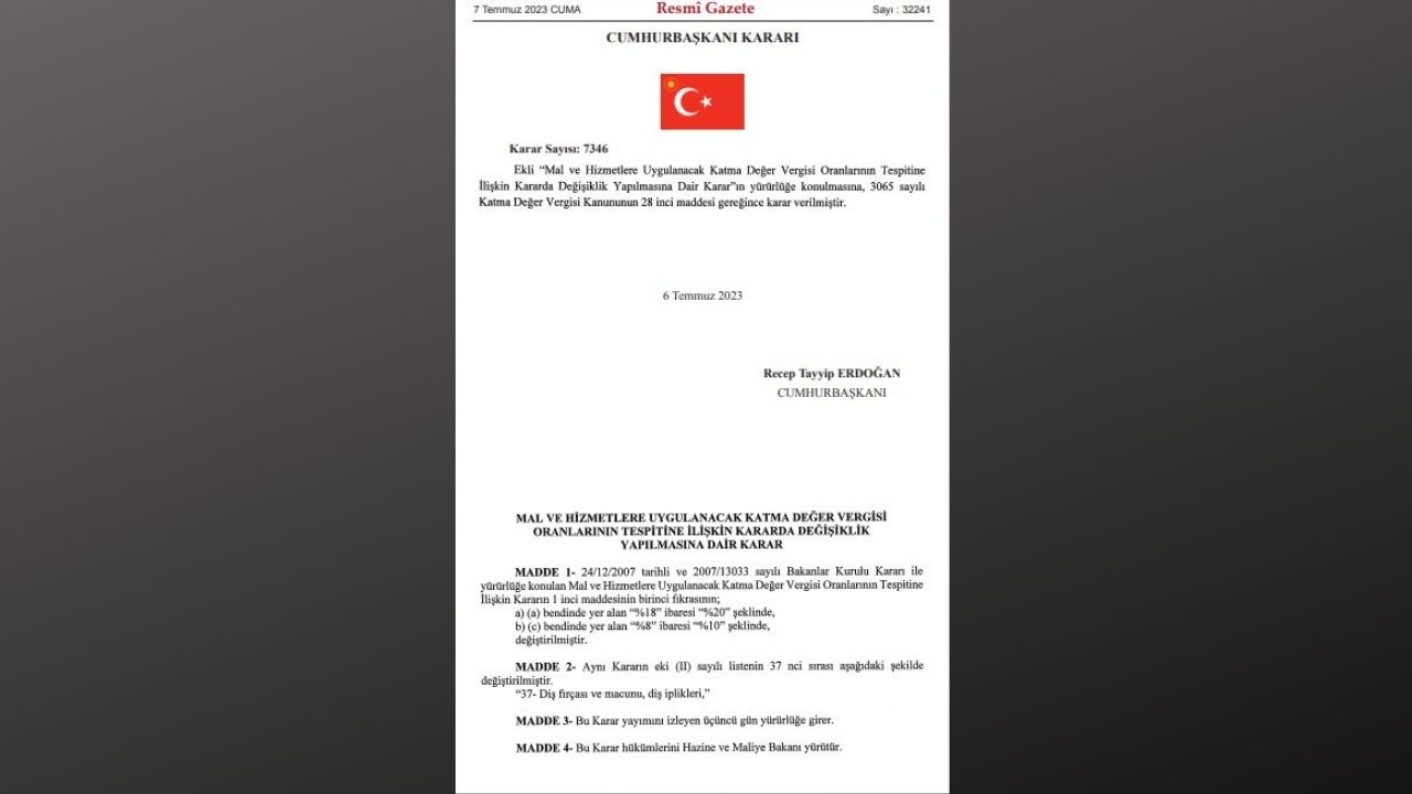 Türkiye’de satılan ve tüm ürünlerden alınan Katma Değer Vergisi (KDV) oranı bu sabah Resmi Gazete’de yayınlanan Cumhurbaşkanlığı kararı ile arttırıldı. Yüzde 8 ve 18 olarak uygulanan KDV oranları yüzde 10 ve 20 olarak arttırıldı.